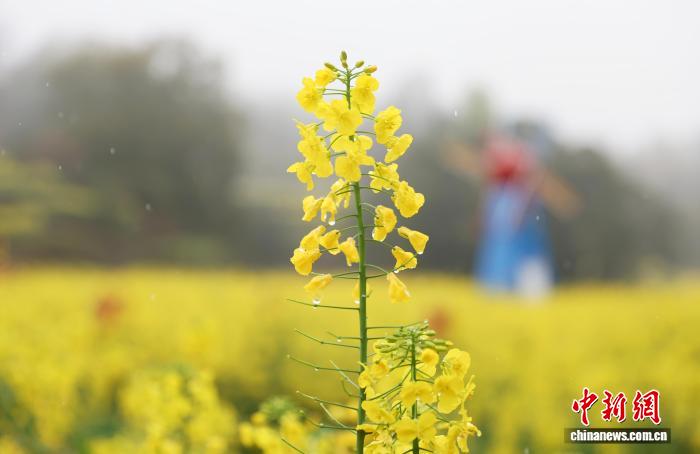 3月24日,江西婺源县江岭景区,雨中的油菜花沾谦火珠。中新社记者 刘占昆 摄